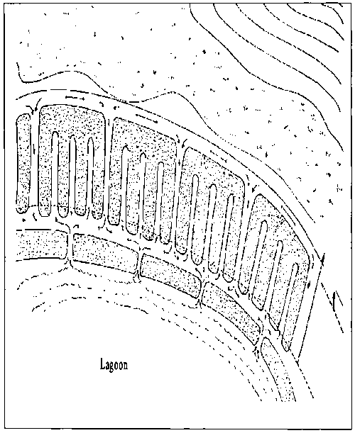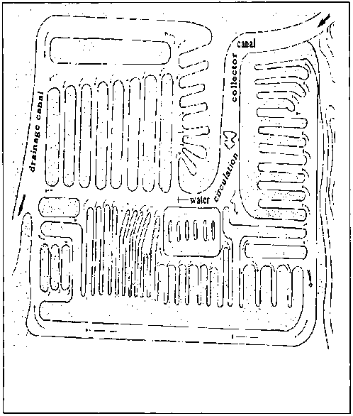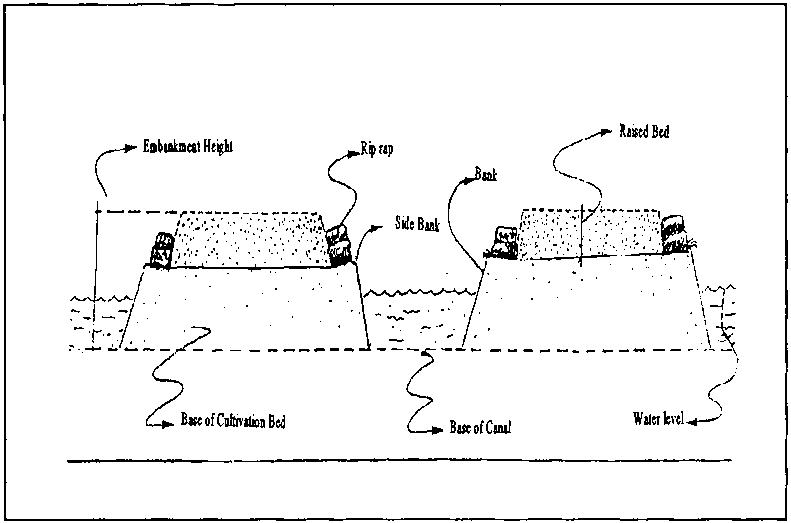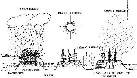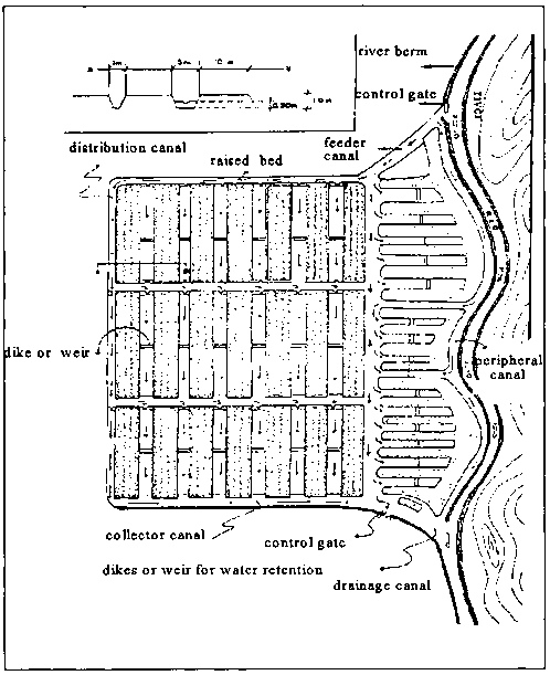 The technology is a combination of rehabilitation of marginal soils, drainage improvement, water storage, optimal utilization of available radiant energy, and attenuation of the effects of frost. The main feature of this system is the construction of a network of embankments and canals, as shown in Figure 32. The embankments serve as raised beds for cultivation of crops, while the canals are used for water storage and to irrigate the plants. The soils used for the embankments are compacted to facilitate water retention by reducing porosity, permeability, and infiltration. Infiltration in the clay soils of the region varies from 20% to 30% of the precipitation volume. Thus, clay soils are preferred for this purpose. Sandy soils have too great a porosity to retain the water within the beds.