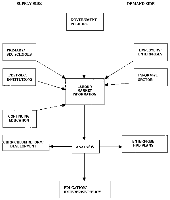 194. During the initial phase, data would be fed into the system where it would be analyzed to see what differences exist between the supply of and demand for manpower. Indications of priority needs would be passed on to those responsible for macro-level policies and plans, both within government and at the enterprise level, where (if the results are seen to be relevant and reliable) they would engender further support for the consolidation of the LMIS as a whole. Further down the line, such information would form the basis for the revision and/or development of curriculum to make the formal supply sector more responsive to labour market needs and provide basic data for an elementary career guidance system. It could also be used to design in-plant training to supplement the anticipated skills of new entrants to the workplace and to plan for future off-the-job staff development.