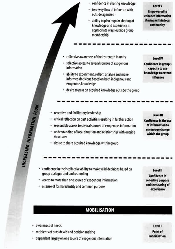 A detailed assessment of the characteristics of the 75 RPAs and GDOs encountered during the research suggests that various levels could be proposed with regard to observed information flow and empowerment. A total of five levels are therefore proposed with regard to the groups' access, use and ownership of information. The level of empowerment with regard to information access increases through the various levels. These levels describe the attributes of a group as an entity and may not apply equally to all members in the group, since some individuals will have more confidence than others. These levels therefore describe group characteristics; the sum of their members potential. Figure 6 provides a summary of these levels and key indicators for each level.