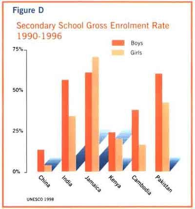 In many education systems there is no overt distinction between primary and junior secondary education. Basic education is often defined to include the junior years of secondary education; seven to nine years of schooling in all. The two greatest challenges for the secondary level are to absorb the growing numbers of students from expanded primary systems and to provide a quality of education which will build on their basic knowledge and skills, broaden their competencies and enhance their employment opportunities. Many developing countries start from a low base: 23% secondary Gross Enrolment Rate for boys and 14% for girls in the least developed countries in 1995. Figure D provides examples.
