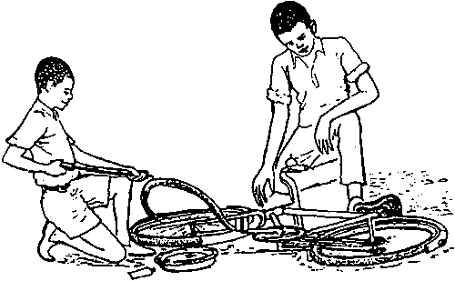 Once there was a boy who was walking along the road. at the same time he saw a man sitting with his bicycle and the boy said. hello sir, what are you doing? I am mending my bicycle the man answered. Can I help you a boy asked. what should I do ? First take out the tube from the tyre and find out the puncture. I will prepare it for you So the boy is helping the man. |