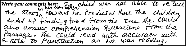 The following examples drawn from oral samples in Malawi gives an illustration of the kinds of work considered to be at levels 1-4. In these examples, the verbatim records as written by the teachers are illustrated in the boxes below and the teachers comments, justifying their decisions to award a particular level, are also reproduced.