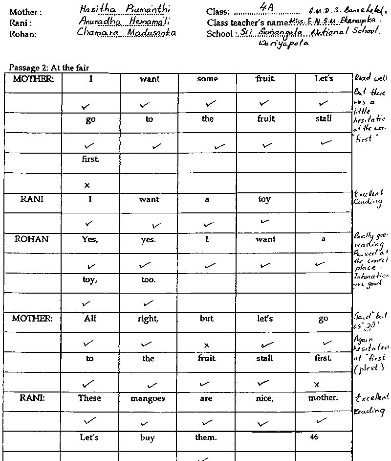 As in Malawi, the tasks were designed to assess childrens abilities to communicate orally in different communicative contexts. Here too, teachers were asked to select six to ten children in their classes on the basis of whom they thought were good, average and weak communicators. Once they had made their selection, they were to write the names of these children on a Record Sheet which was provided. Over the course of the research, the communicative competencies of the selected sample of children were assessed.