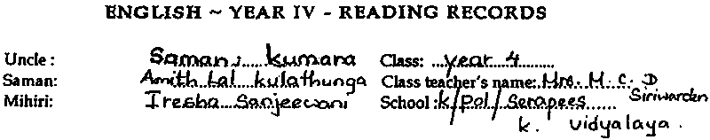 Mihiri - She was very fluent in her reading. She has no hesitation and no mispronuncation. Expressing ideas was good. Rising and falling was there.