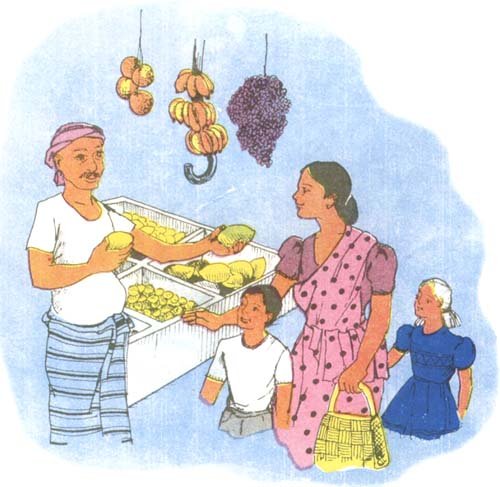 The task comprised of an illustration, taken from a reading book in for ten year old children in Sri Lanka - Lets Go to the Fair. The illustration is of a mother and her two children buying fruit from a fruit stall. The selected students were to look at the illustration and talk about it.