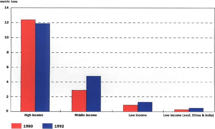 Data refer to emissions from industrial processesFIGURE 11 - Carbon Dioxide Emissions, by Income Group of Country, 1992Source: World Development Indicators 1997.