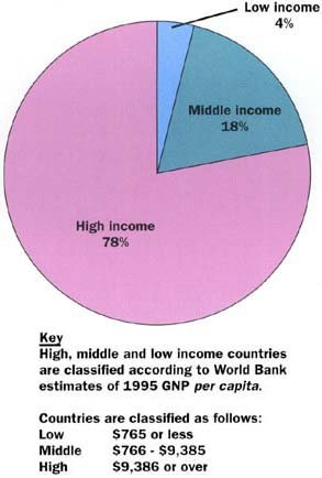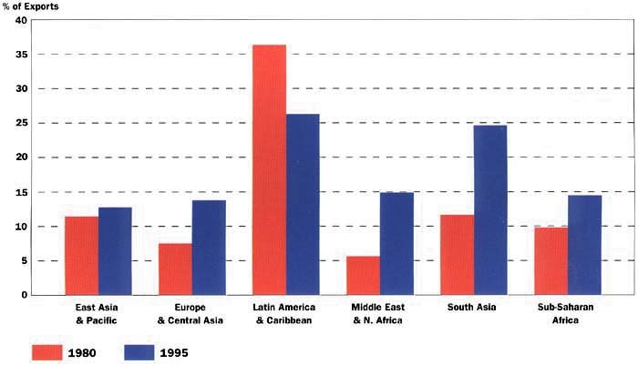 · We will press for the elimination of tariffs on imports from the least developed countries, and for eventual agreement to eliminate tariffs multilaterally within a WTO scheme.FIGURE 13 - Shares of World Exports, 1995· We believe that the current Lomé and Generalised System of Preference (GSP) terms should be brought into closer alignment by seeking ways to level up preferences and by extending product coverage within GSP to include all industrial goods and a wider range of agricultural goods. We will focus in particular on sectors likely to be of benefit to poor countries and poor producers.