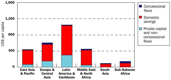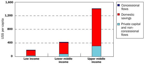 281. Domestic savings are the main source of finance for investment throughout the developing world (see figures 7.1 and 7.2). Many middle income countries, such as those in Latin America and Eastern Europe, are better able to supplement these resources by attracting private investment and loans from developed country governments and international financial institutions. Poorer countries, such as those in south Asia and sub-Saharan Africa, not only have much lower savings but have little or no access to foreign investment and lending.