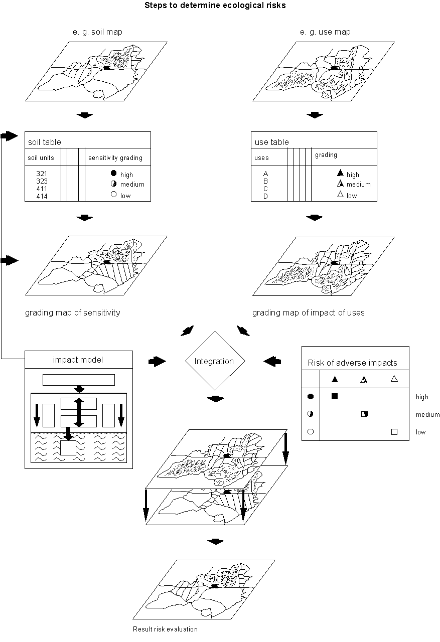 An inventory of the overall ecological situation involves ascertaining and evaluating the protective functions and benefits of natural resources on the basis of their suitability and sensitivity characteristics as well as relevant land-uses and their environmental effects. Once the causal connections (originator - environmental impact - effects on the resource in question [environmental impact]) are known, the status quo i.e. the scale of existing problems ('initial loading') can be determined. This provides the basis for a forecast of future environmental threats from planned land-uses and individual projects. The methodological approach on which this procedure is based is known as ecological risk analysis (see Fig. 2)9) .