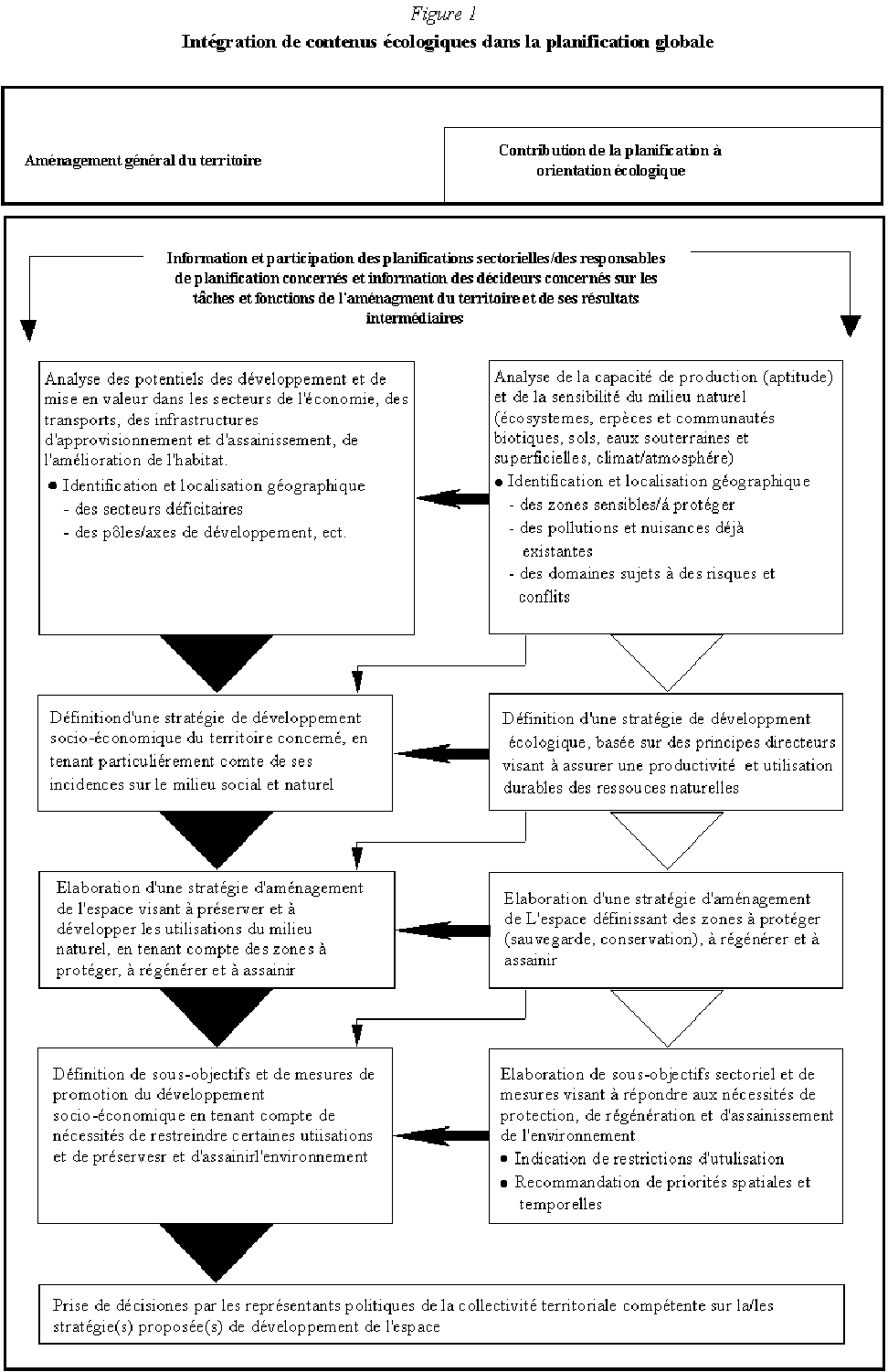 Les questions d'ordre écologique sont traitées comme une composante de la planification régionale et sont intégrées aux différentes phases de travail (cf. Figure 1). La coordination des objectifs prioritaires et des nécessités d'action se fait au sein des structures administratives. Il faudrait ici s'efforcer d'optimiser les approches de développement global du territoire en vue d'assurer la prévention ou la réduction des atteintes à l'environnement.