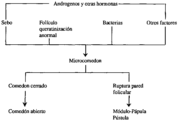 La patogenia del acné es multifactorial y deben considerarse de importancia la unidad pilosebácea, los microorganismos y la respuesta del huesped a los eventos que ocurren en el interior de la glándula sebácea.