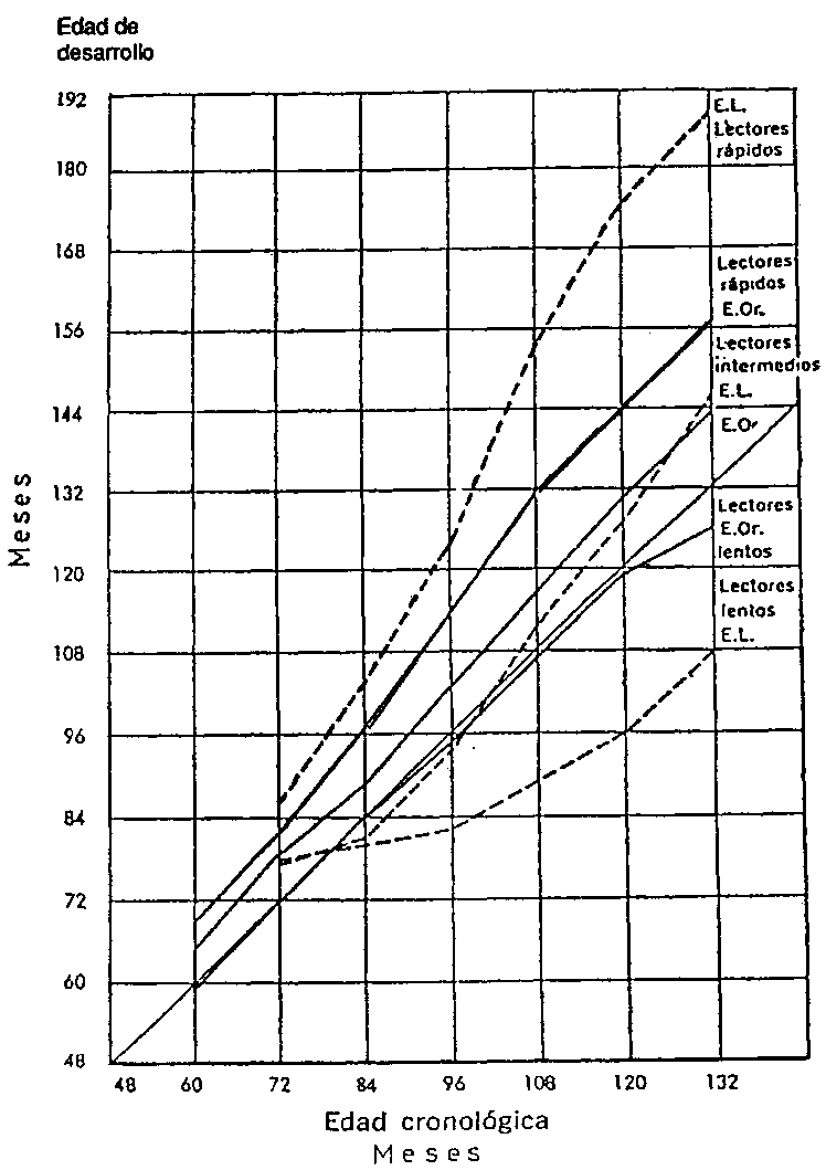 Fig. 5 La correlación de la edad en lectura (EL) con las edades orgánicas detalladas en la Fig. se mantiene como cuestión muy interesante, aun en casos en los que todos estos parámetros se mantengan por encima de la diagonal normal de la gráfica del desarrollo de Wilkins (de acuerdo a Olson, v. Bibliografía).