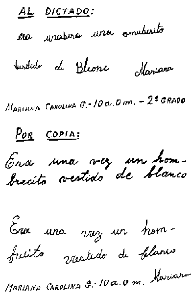 Los déficits en la prueba de escritura fueron siempre de menor intensidad; alrrededor de un grado escolar por debajo del nivel correspondiente. Sin embargo el paciente Diego B. (Caso N° 20), de 13 años de edad para el momento del diagnóstico presentó muy frecuentes errores en su escritura al dictado (Fig. 7).
