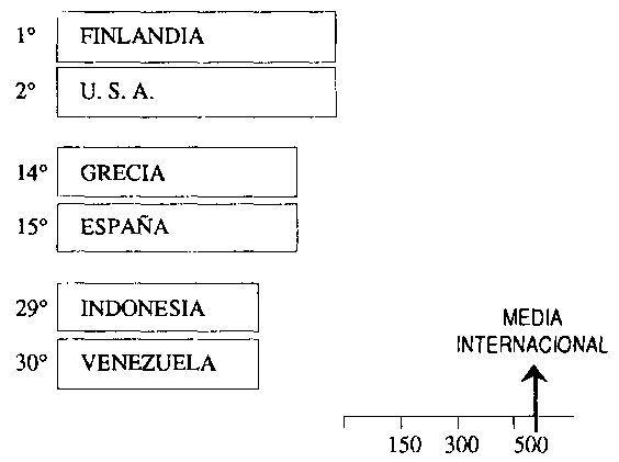 Las anteriores aseveraciones, en lo concerniente a nuestro país, han tenido respaldo sólido con motivo de la siguiente investigación: la International Association for the Evaluation of Educational Achievement, conectada al Institute of Education de UNESCO, con asiento en Hamburgo y actuando como coordinador el Prof. Warwick B. Elley, ha aplicado entre 1990-1991 un test de lectura adecuado y similarmente estructurado para evaluar la capacidad de la lectura con carácter internacional, en 210.050 alumnos (93.039 de 10 años de edad y 117.020 de 14 años), en 32 naciones pertenecientes a varios continentes; los interesantísimos resultados han sido publicados en un libro intitulado How in the World do students read? (1992): pues bien, en esta sólida investigación, entre otros detalles, lamentablemente resalta que los alumnos venezolanos de 10 años de edad, ocuparon en rendimiento del mencionado test de lectura, la última posición entre 30 países en donde se realizó la investigación (Fig.9), y entre los alumnos de 14 años de edad, Venezuela ocupó el 29° lugar seguida de Nigeria, Zimbabwe y Botswana.