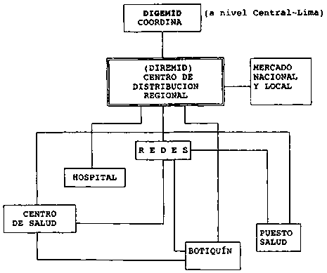 El sistema descentralizado de suministro, propuesto por el PACFARM, está constituido por un centro regional de distribución para toda la Región Loreto dentro del siguiente esquema: