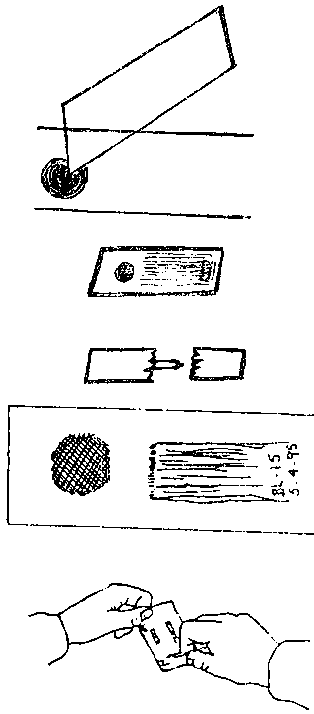 · Con la punta de ésta lámina extender en forma circular la primera gota (del extremo) hasta formar un círculo de +/-1 cm. de diámetro. Debe que quedar 1 cm. de espacio entre la gota gruesa y el extremo de la lámina.· Dejar secar la muestra.