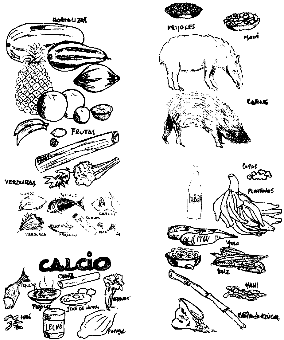 · Una pequeña cantidad del caldo o de la sopa + harina de maíz + fréjol + verduras (col, caihua, o zapallo) + pescado o carne de monte + una pizca de sal + 1 cucharadita de aceite.