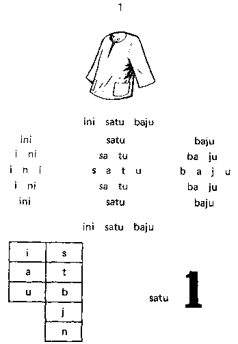 En el primer ejemplo, proveniente de Indonesia, aparece el dibujo de una camisa en la parte superior de la página. Debajo del dibujo aparecen las palabras en Indonesia Babasa que significan "Esta es una camisa". Cada palabra está dividida en sílabas y letras. Cada una se junta en sílabas y palabras. Por último se escribe de nuevo toda la oración. Al final de cada página aparecen las letras solas y el número uno. Las páginas sucesivas siguen el mismo patrón añadiendo palabras y números.