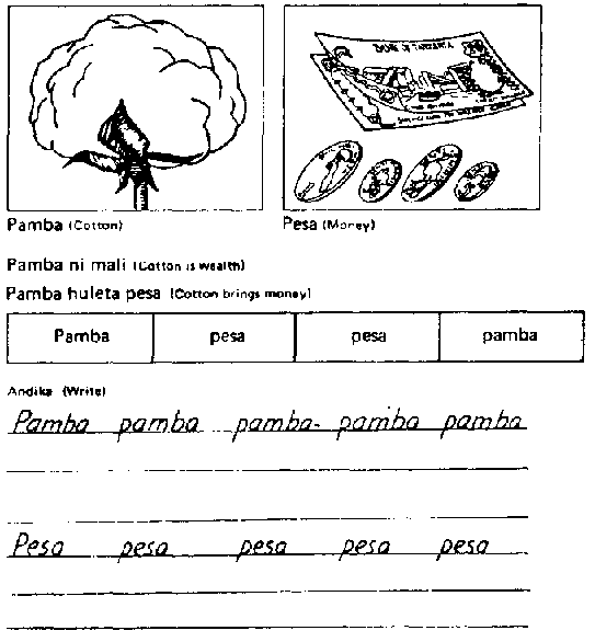 En un ejemplo de Tanzania, se utilizan dos dibujos con una palabra escrita debajo de cada uno. Después de que se han discutido los dibujos y las palabras se han practicado, se presentan dos oraciones simples. Las dos palabras se presentan de nuevo para reforzar antes de pedirle a los aprendices adultos que practiquen su escritura.
