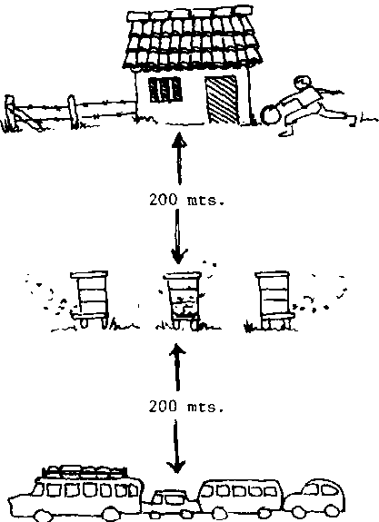 Primero, es necesario alejar las colmenas de las casas, porque los ataques de Abejas son muy peligrosos, tanto para personas, como para animales domesticas. Las distancias recomendables de los apiarios de las áreas urbanas y poblaciones son: