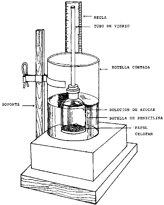Procedimiento: Para probar esta hipótesis se ató un pedazo de papel celofán al extremo inferior de una botella de medicina sin fondo. Se llenó la botella con una solución de azúcar. Se cerró su boca con un tapón de jebe de un solo agujero el cual contenía un tubo de vidrio. Se llenó aproximadamente 1/3 del tubo de vidrio con la solución de azúcar y se le unió un pedazo de papel cuadriculado para que sirviera como regla de medida.