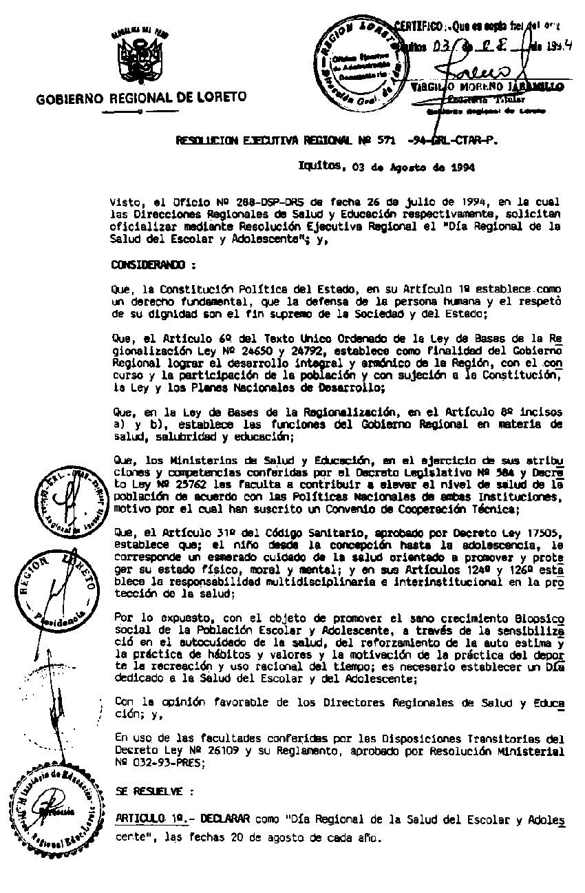 Desde ahora el 20 de Agosto de cada año se celebra el "Día Regional de la Salud del Escolar y del Adolescente" gracias a las gestiones de la Dirección Regional de Salud y la Dirección Regional de Educación.