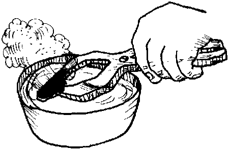 9. Si está negrito y brillante, retíralo, sujetándolo con una pinza o alicate y mételo en agua fría cruda, ya sea de pozo, de río o quebrada (no meterlo en agua tratada con cloro o hervida) durante unos segundos. Así se hará más dura la piedra.