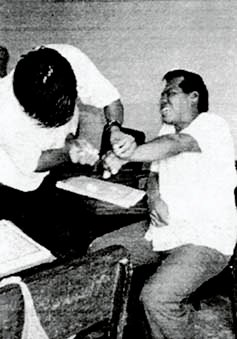 TAE Jorge García recibiendo pinchazo de parte de su compañero Fernando Velásquez en demostración de como sacar muestra de Gota Gruesa.