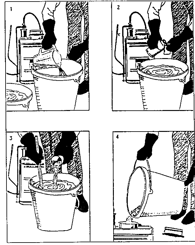 For the preparation of EC formulations pour the required amount of water in a bucket (1), add the calculated amount of insecticide with a measuring cup (2) and thoroughly mix using a stick (3). The mixture should then be filled into the sprayer through the filter located on the insecticide tank (4) in order to avoid the clogging of the nozzle by din. EC liquids for spraying are stable mixtures (emulsions) which do not separate even after longer periods.
