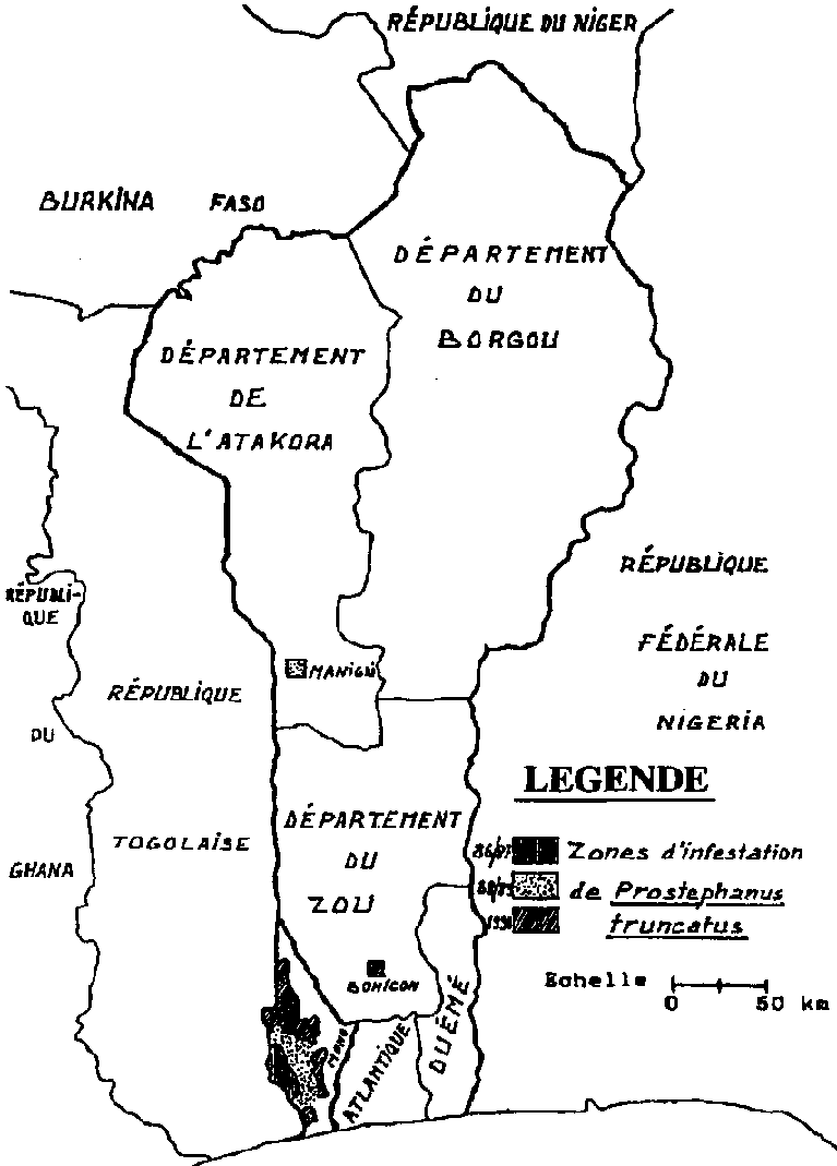 Hormis le Département du Mono, P. truncatus a été identifié en 1989 dans la région Nord-Ouest du Bénin précisément dans un village de L'Atacora puis en 1990 dans un village du centre du Bénin. C'est dire que le parasite tente de gagner tout le pays. A cet effet, une prospection générale a été prévue pour le mois de Décembre 1990.