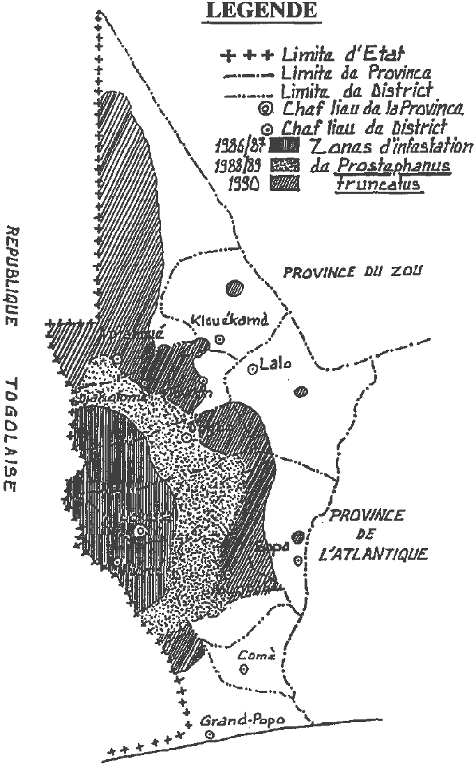 Le Grand Capucin du Maïs Prostephanus truncatus a été identifié pour la première fois. en janvier 1986, dans le Département du Mono, dans un village situé non loin de la frontière entre le Togo et le Bénin (Krall et Favi, 1986).