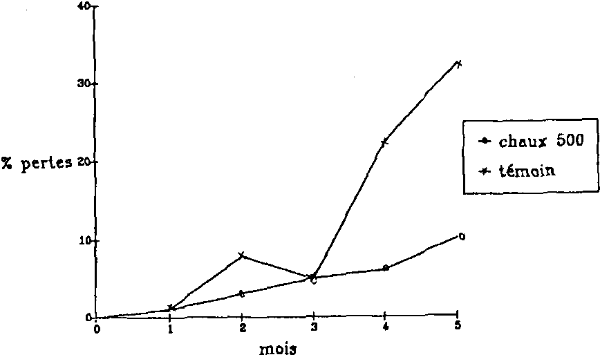 Le traitement du maïs en spathes avec la chaux éteinte (Ca (OH)2) avait aussi donné des résultats intéressants sur le complexe parasitaire, les pertes en matière sèche ayant été maintenues à moins de 10% jusqu'à 5 mois de stockage. Ceci justifie l'attention particulière dont bénéficie cet hydroxyde de calcium au niveau du Service National de la Protection des Végétaux (Fig. 5).
