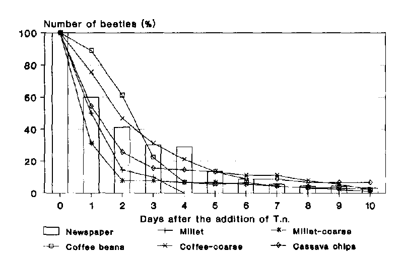 The beetles left more quickly than the newspaper. There were more beetles left only on maize, sorghum, coffee beans and coarsely ground coffee beams. On the third day, the proportion of T. nigrescens found on the substrates had, however, also fallen to a level comparable to the control. The products evidently had no special attraction for the beetles. In total, an average of 82% of T. nigrescens had left after 3 days, and after 5 days, this already amounted to 93%. No tendency could be observed for a larger number of adult T. nigrescens to remain on any of the substrates for a longer period of time.