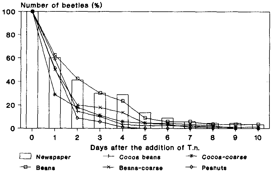 The majority of adult T. nigrescens left during the first two days (Fig 23, 24 and 25). The proportion of beetles found on most of the stored goods had declined to less than 30% after 2 days.