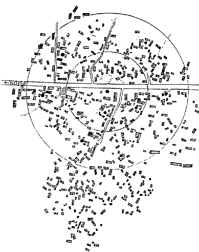 T. nigrescens was released in Togo in the village of Tsagba, located east of Notse, near to the Benin border. Fig. 26 shows the observation stores entered on a plan of the village and numbered. 2 circles have been drawn around the point of release with a radius of 100 m. and 200 m. At the time of release, 11.45 a.m. there was a slight wind (0-1 m/s) from north-east. At 1.30 p.m., the wind came from the south at the same speed.