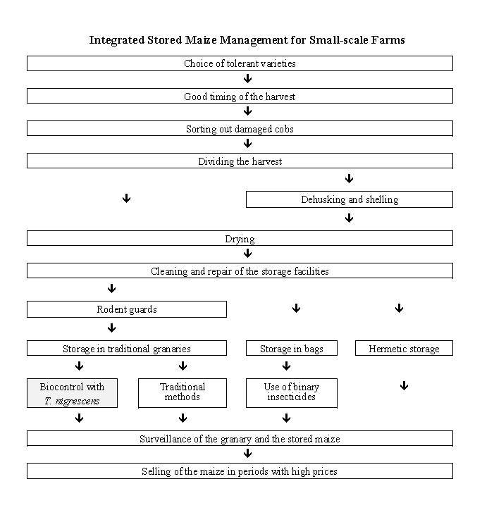 For maize stored at farm level an integrated post-harvest management strategy may follow the pattern on the flow-chart on the following page. This pattern provides a range of options, depending on the local potential and preferences.