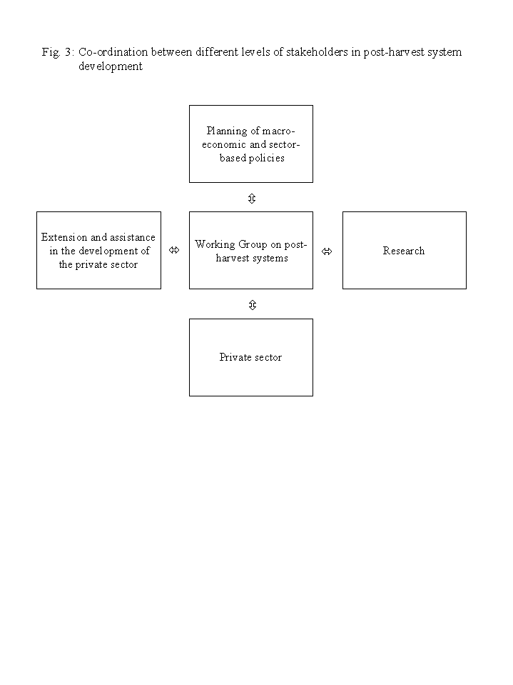 In the post-harvest sector, the co-ordination of the different government activities is more important than others, because responsibilities are shared by many Ministries and Departments. As in agricultural production, co-operation between research and extension is primordial. Co-ordination with macro-economic planning and sector-based policy is a decisive factor. The most promising procedure for establishing such a co-ordination would be the creation of an interdisciplinary working group (see figure 3). These three aspects of the public sector should be discussed with representatives of the private sector.