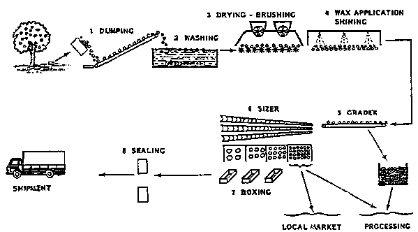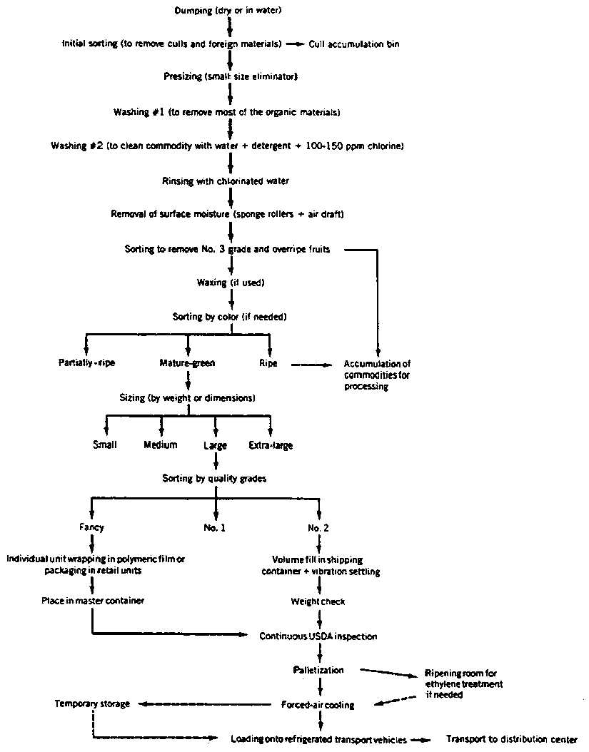 The following is a flow diagram of packinghouse operations. The number and size of packing lines will depend on the kinds and quantities of produce that are handled each day.