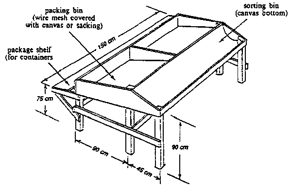 The table illustrated below is a combination sorting and packing stand. Incoming produce is placed in the sorting bin, sorted by one worker into the packing bin, and finally packed by a second worker. If workers must stand to sort produce, a firm rubber pad for the floor can help reduce fatigue.
