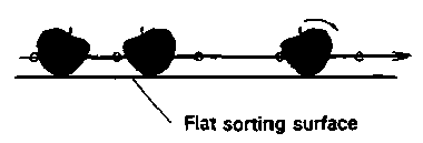 The following illustrations represent three types of conveyors used to aid sorting of produce. The simplest is a belt conveyor, where the sorter must handle the produce manually in order to see all sides and inspect for damage. A push-bar conveyor causes the produce to rotate forward as it is pushed past the sorters. A roller conveyor rotates the product backwards as it moves past the sorter.