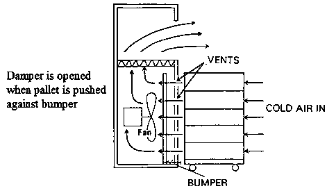 Forced-air cooling pulls or pushes air through the storage containers themselves, greatly speeding the cooling rate of any type of produce. Many types of forced-air coolers can be designed to move cold moist air over the commodities. The example provided below is a fixed unit, where a fan is housed inside the wall of a cold room