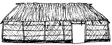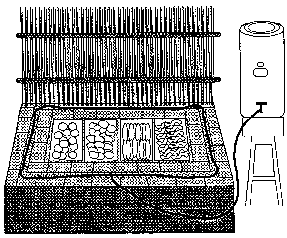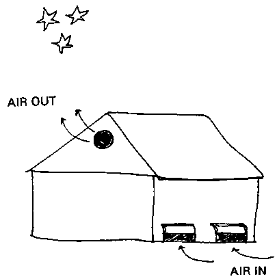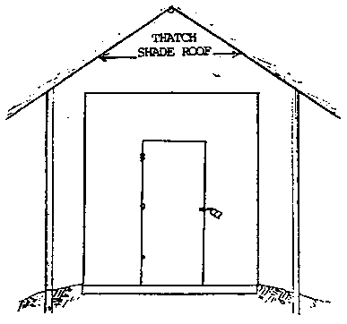The packinghouse illustrated below is made with walls of wire mesh that hold charcoal. By moistening the charcoal with water each morning, the structure will be evaporatively cooled during the day.