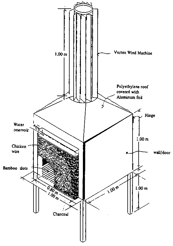 The evaporative cooler shown below is equipped with a vortex wind machine. Chicken wire was used to construct two thin boxes on opposite sides of the cooler that hold wet chunks of charcoal or straw. Water is dripped onto the charcoal or straw, and the wind turns the turbine, sucking moist, cool air through the load of produce inside the cooler. When using this cooler, temperatures are reduced to 3 to 5 C (6 to 10 F) below ambient air temperature, while relative humidity is about 85 %.