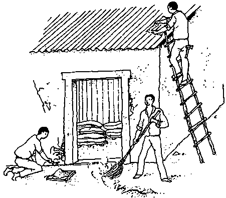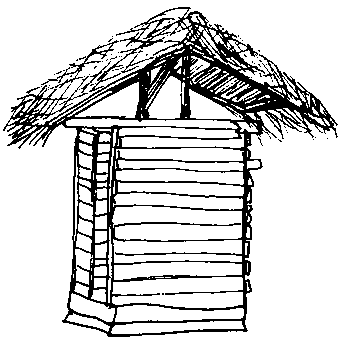 Simple storage houses for potatoes can be constructed for small quantities of produce. The examples provided here can store 1 to 2 metric tons, and are used on farms and in mountain villages. The first is made from unfinished wooden planks painted white to reduce heat accumulation from the sun and covered with a large thatched roof for protection from sun and rain. It has a large door on one side for loading and unloading.