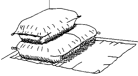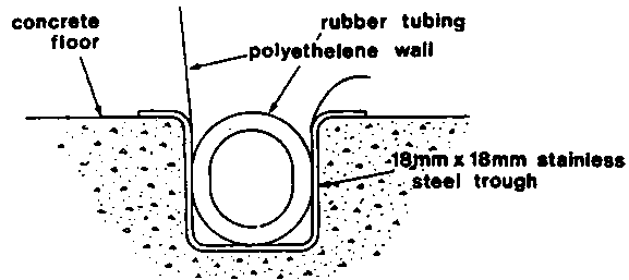 Controlled atmosphere storage of pallet loads of produce is also possible using a more permanent set-up for creating a gas-seal. Any number of pallets can be accomodated inside a plastic tent. A small trough constructed of sheet metal is laid in a rectangular pattern into a concrete floor of a storage structure. A 7-mil polyethylene sheet is put over the pallet load of produce, and the sheet is sealed by pushing a long piece of rubber tubing into the trough.