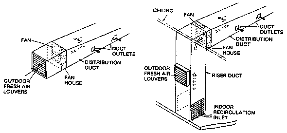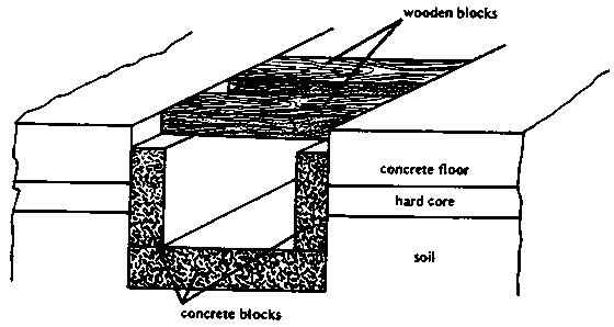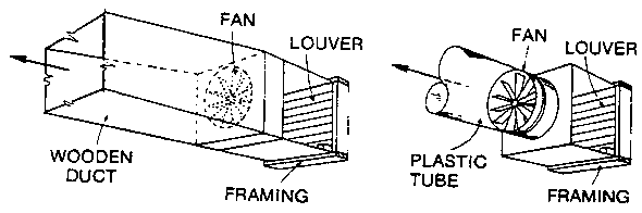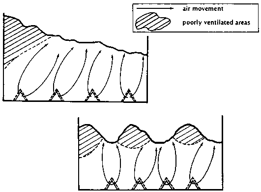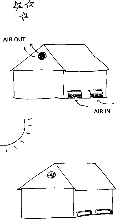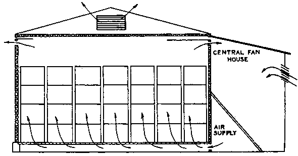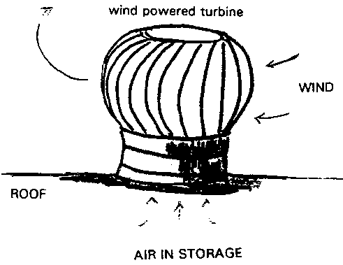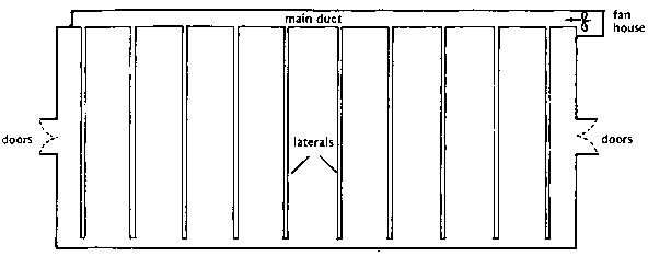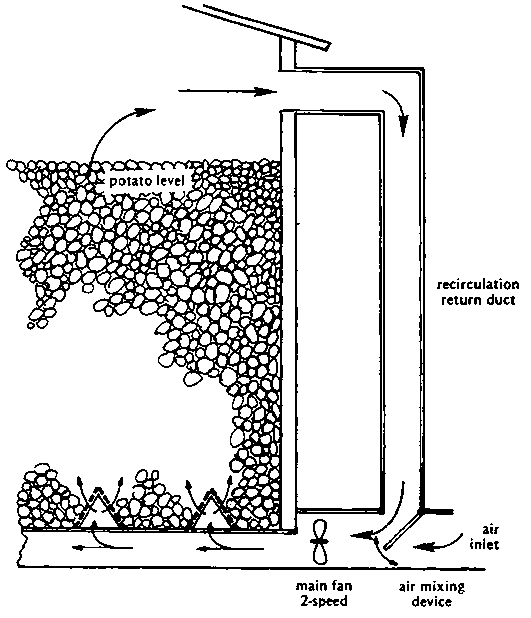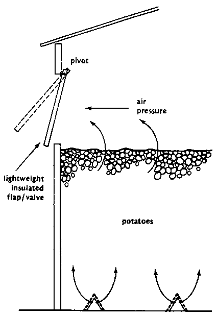 Ducts for ventilation of bulk storage rooms can be laid out vertically as well as horizontally. The storeroom for potatoes shown below provides for plenty of ventilation using simple materials. The room can be of any size or shape since air ducts can be positioned to extend evenly throughout.