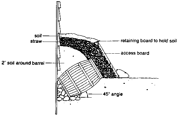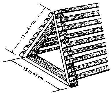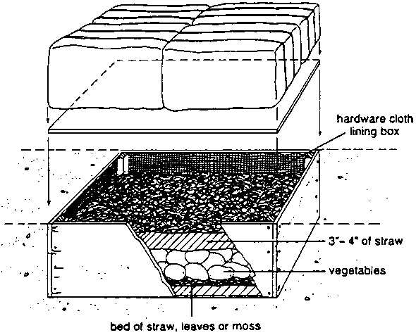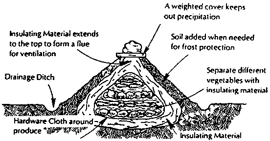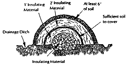 For large quantities of potatoes, a self-supporting A-frame storehouse can be constructed. A pit is dug about 10 feet deep and wooden air ducts are placed along the earthen floor. The roof of the building is constructed of wood, then covered with straw and soil.