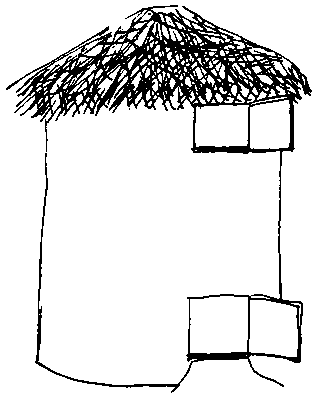 The second storage house is constructed from lath and plaster and mud bricks in a cylindrical form. It has two doors, one on top for loading, the other at the bottom for easy removal of potatoes for sale or consumption. White-wash helps reduce heat accumulation and a thatch roof protects the potatoes from rain and sun.