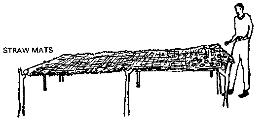 A simple method for solar drying is to construct a raised platform from wood and cover the frame with loosely woven mats. In the illustration below, sliced fresh tomatoes are being dried in direct sunlight on straw mats. Air can pass over and below the produce, speeding drying and reducing losses due to overheating.