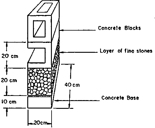 The solar drier for cassava chips illustrated below consists of a solar collector, a fan, and drying bin. The solar collector is constructed on a concrete base, using a layer of fine stones and two layers of concrete blocks, all covered with polyethylene.